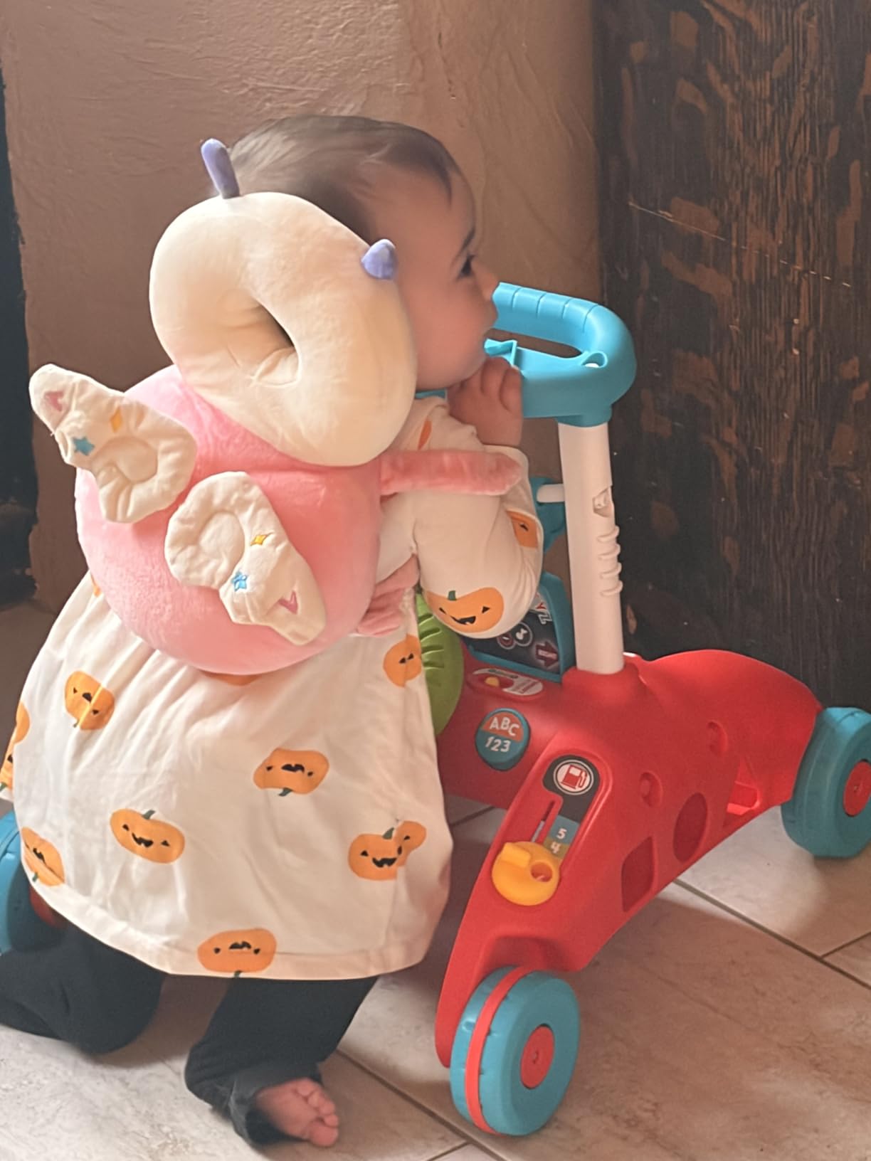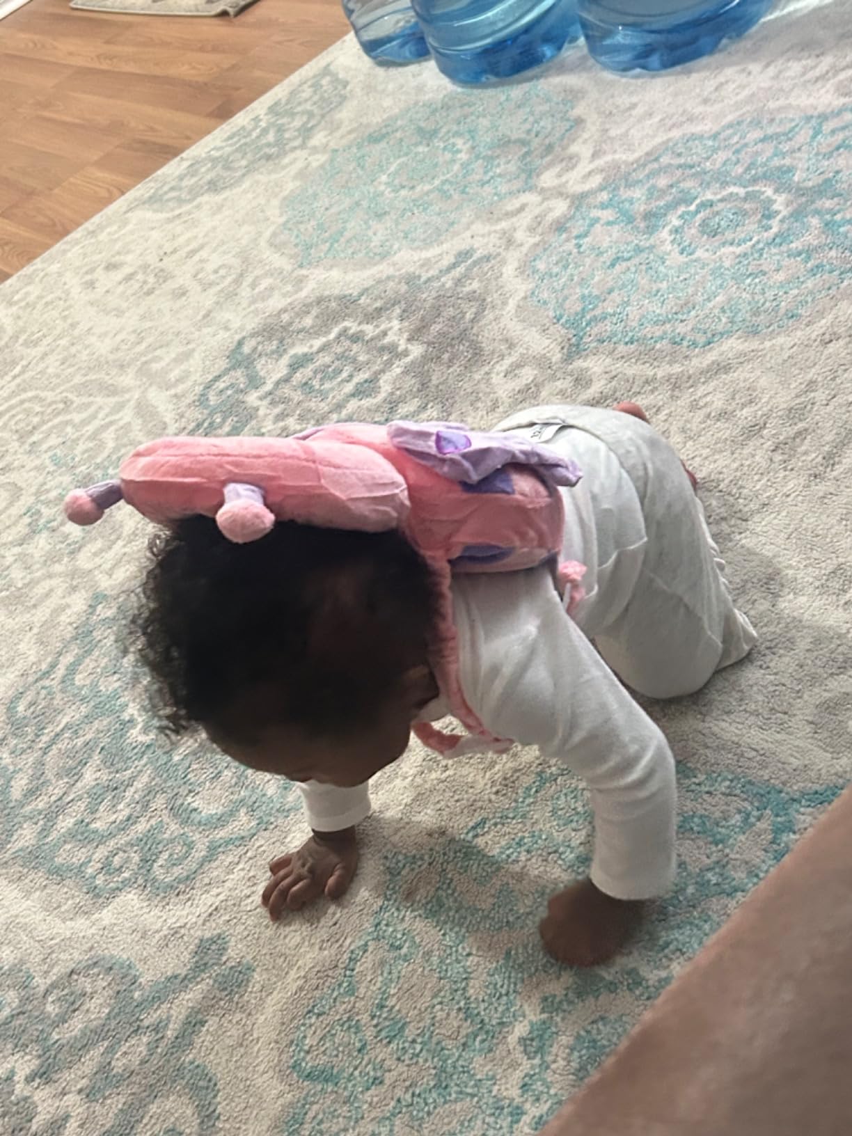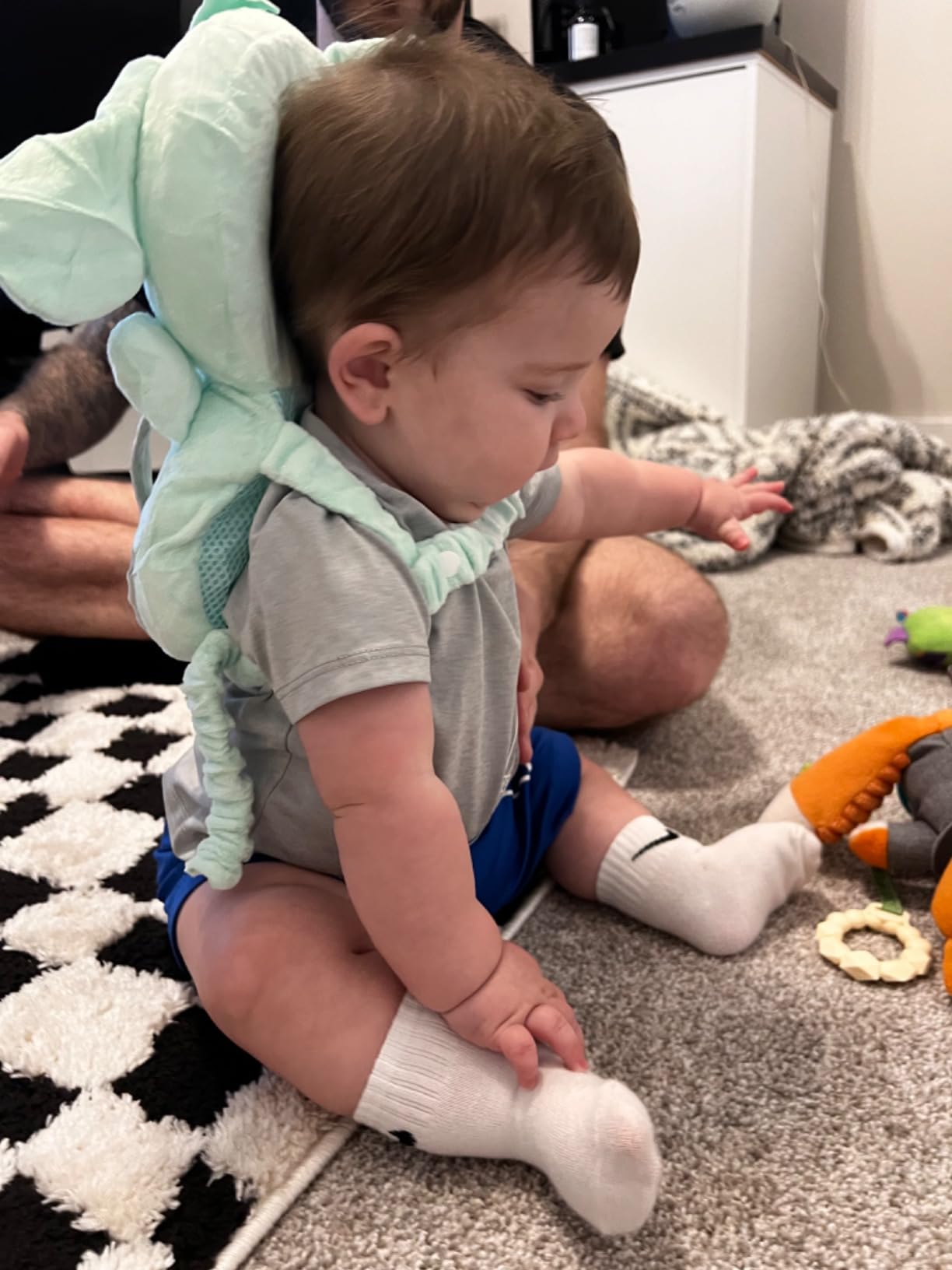 Problemet:Småbarn tappar balansen ofta när de tränar motoriken – särskilt bakåt, där huvudet lätt kan slå i golvet.